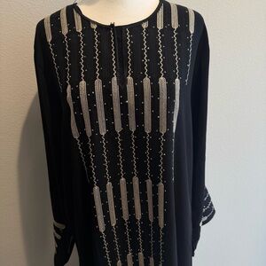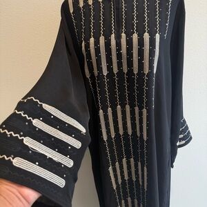 Black embroidered abaya with cream threadwork and embellished detailing.