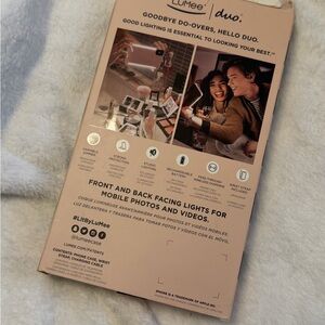 Stylish Lumee light up phone case with a purple marble design. Includes a USB charging cable. Perfect for enhancing your selfies.
