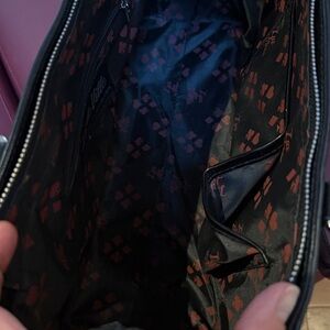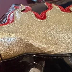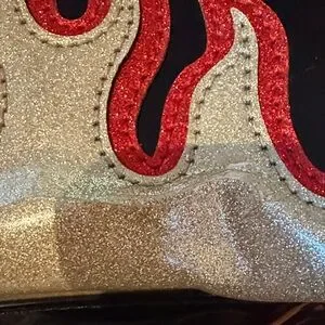 Eye-catching black bag with gold and red flame design. Adds flair to any look.