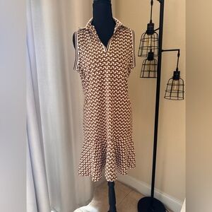 Chic top with a geometric brown and cream design. Ideal for versatile styling. This knee length sleeveless dress features a flattering V-neckline and a fit and flare silhouette, perfect for a casual occasion. Made from nylon, the brown geometric print adds a trendy touch to the overall design. The medium size and regular fit make it a versatile piece for summer, fall and spring seasons. Add this chic dress from J. McLaughlin to your collection for a touch of sophistication and style. IN PERFECT CONDITION!!