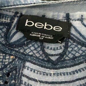 This chic jean jacket from Bebe features a light blue denim with a striking navy blue embroidered pattern around the neckline. The cropped style and gathered 3/4 length sleeves add a modern touch, while the gold-toned zipper closure offers a hint of elegance.