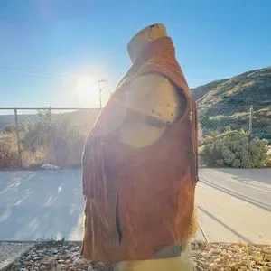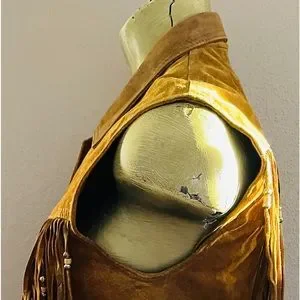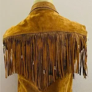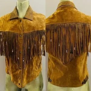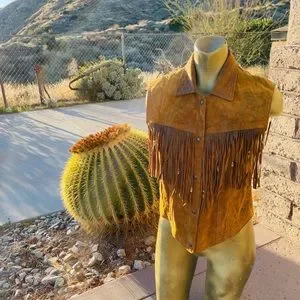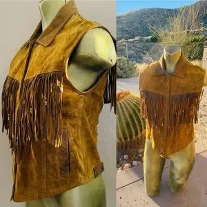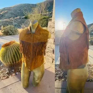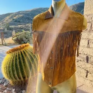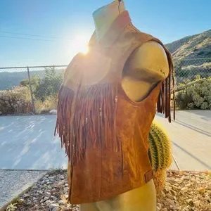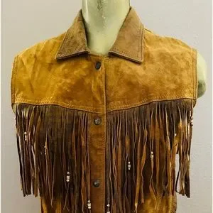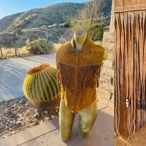 This is a cool vintage 80s suede leather vest by the leather ranch size one. Made in Canada, item is genuine leather with acetate lining. Vest is fully-lined. Item has snap button front closure and two snap buttons at sides of outer waist so item can be tightened or loosened as desired. Seamed detailing and two lined pockets at front waist area. Suede and leather fringes adorn item and they are trimmed in gold and tan colored beads. Trim of pockets and collar is smooth leather, rest of item is suede leather. Approximate measurements are 36 inches at bust, 32 inches at waist, 23 inches in length. Item sold in good vintage condition.