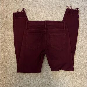 Stylish skinnies with distressed bottoms. Color brings visual interest!