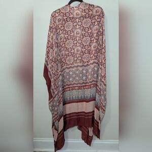 Embrace a bohemian vibe with this beautifully patterned kimono. Featuring rich red and blue tones, it's perfect for any occasion.
