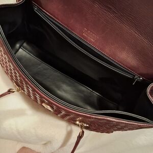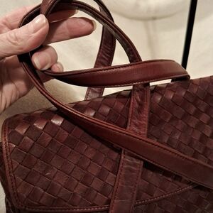 Elegant woven suede and glove leather. Rich burgundy color. Gold-tone hardware. Double handles for easy carrying.