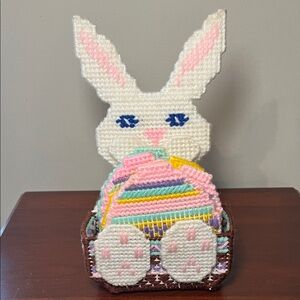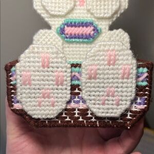 Adorable handmade bunny yarn coaster holder. Features a cute bunny design with colorful yarn details. 8.75” tall x 2” deep and holds 7 handmade crochet knit granny square style coasters in excellent vintage condition never used no stains or marks. Each coaster measures 4.5” x 3.5” needlepoint.