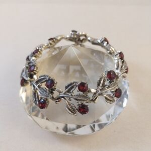 This stunning bracelet features a silver leaf design adorned with vibrant purple gems. A perfect accessory to elevate your style.