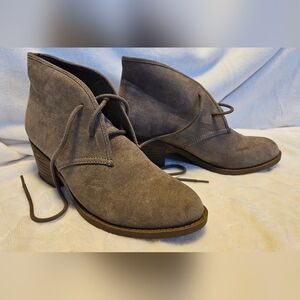 Stylish gray suede ankle booties with a chic lace-up design. Perfect for versatile wear.