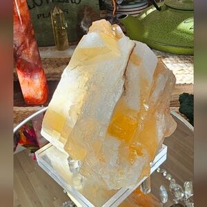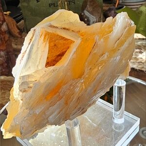 Yellow Glowing Angel Wing Calcite Specimen With Crazy Good Cave and some UV reaction. Super fine blades and cube like formations make this piece a standout! Light her up theres a like pure yellow orange that is reminiscent of gorgeous sunshine! Very uplifting energy!!