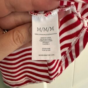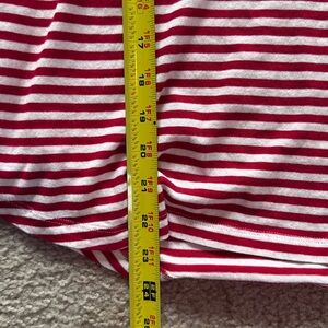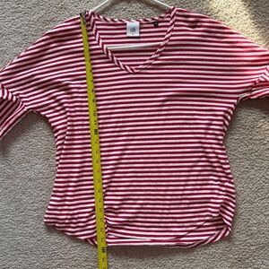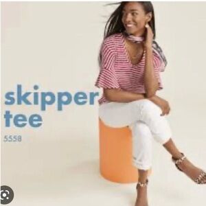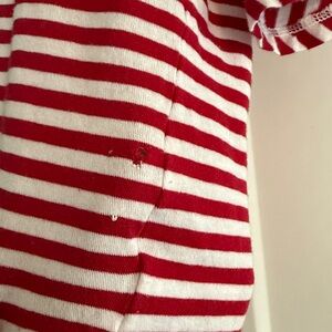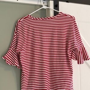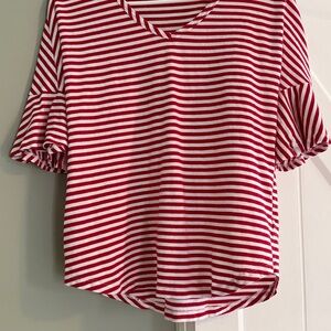 CAbi Skipper Tee- red, white, ruffle sleeves. Good condition. There are a few very small holes near the left front hem (see pics). These could be easily sewn.