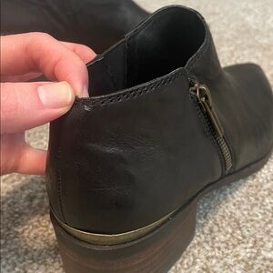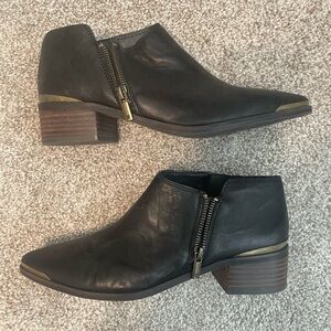 Lucky Brand Black Leather Pointy Toe Ankle Booties w Distressed Gold Accents Sz9