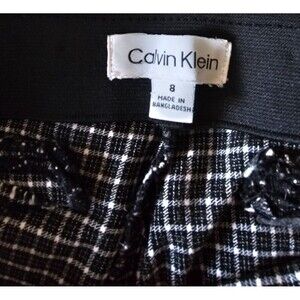 The NWOT Calvin Klein black Houndstooth pattern Women's Stretch Pants in size 8 are stylish and versatile dress pants perfect for various occasions. Made from rayon material, these pants feature a flat front design and offer stretch for comfort and a flattering fit. The classic black color and check pattern add a touch of sophistication to any wardrobe, making them a key piece for women looking for a chic and timeless style.