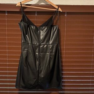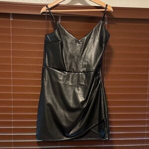 Chic black mini dress with faux leather finish. Features a stylish draped design. Perfect for a night out.