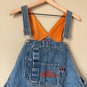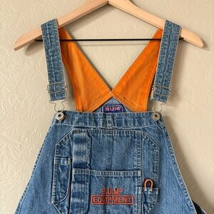 vintage overalls, denim short overalls, bum equipment, 90s workwear, carpenter overalls, utility denim, grunge overalls, y2k denim, vintage streetwear, festival outfit, orange accent denim, bib shorts, unisex vintage, womens vintage denim