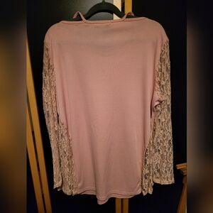 This elegant women's top features delicate lace sleeves, adding a touch of sophistication to your wardrobe. Perfect for any occasion, this pink top offers both style and comfort.