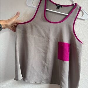 Good used condition with no flaws. This tank top is made of a slinky material that drapes nicely. It is gray with pink accents.
