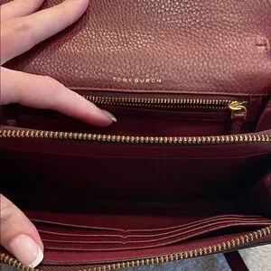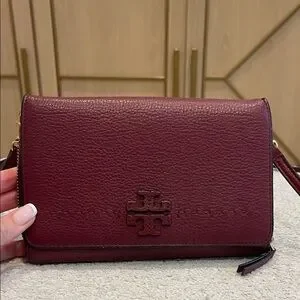 Chic Tory Burch crossbody in deep burgundy. Crafted from premium leather. Perfect for versatile styling.