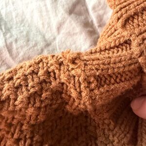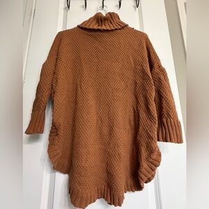 Express cozy cowl neck sweater in a warm camel brown shade. Features a chunky textured knit with a cable-knit detail down the front and a relaxed, slouchy silhouette. Soft and comfortableโperfect for fall and winter layering with jeans, leggings, or boots.