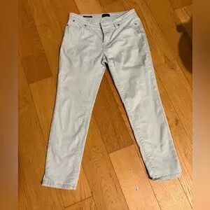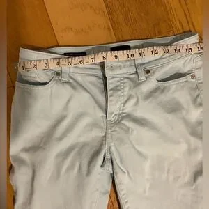 This color is adorable! A very light, powder blue. There is some stretch in this denim that makes these very forgiving. 2 back pockets, 2 front pockets, button and zipper closure.