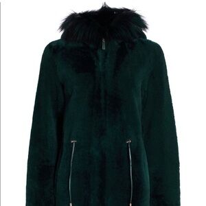 Elevate your style with this elegant dark green leather Maximilian reversible jacket, featuring a luxurious faux fur trim. Perfect for adding a touch of sophistication to any outfit.