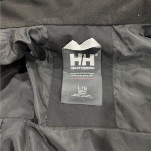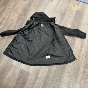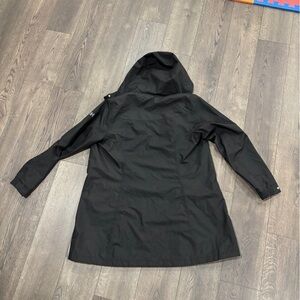 Durable black raincoat with hood. Ideal for wet weather. Features a sleek design.