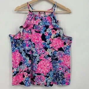 Lilly Pulitzer Billie high tide turtle print Halter Neck tank Top Large Ruffle