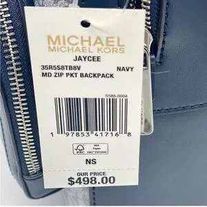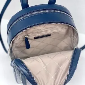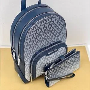 Stylish Michael Kors backpack with matching wristlet. Features navy and gray design. Perfect for daily use.