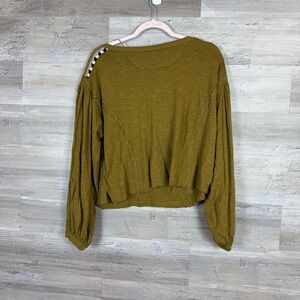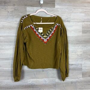 Free People Olive Green Embroidered "Aries" Balloon Sleeve Top - Size L