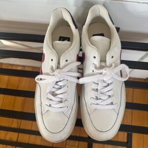 Elevate your look with Veja sneakers. Crisp white with bold burgundy details. Ideal for casual wear.