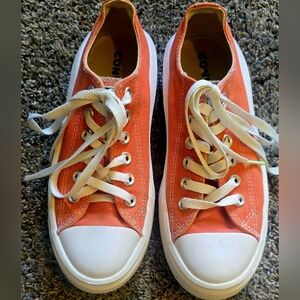 Converse All Star CTAS Move OX Women's Platform Sneakers in size 7 and bright madder color are stylish and comfortable athletic shoes perfect for various occasions such as activewear, casual outings, and workwear. These sneakers feature a lace-up closure, rubber outsole, and cushioned insole for added comfort. With a low-top shoe shaft style and a solid orange pattern, these platform sneakers are a colorful and trendy addition to any wardrobe. Made with canvas upper material and fabric lining, these sneakers are a fashionable and practical choice for everyday wear.