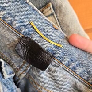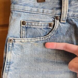Beautiful distressed jean shorts with a raw hem. Functional button fly with pockets. Please note there is a small spot as shown and one of the belt loops has detached. I have not tried to spot treat or sew the loop back on. Otherwise overall the shorts have lots of life left.