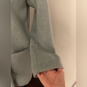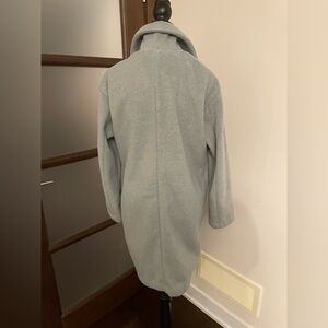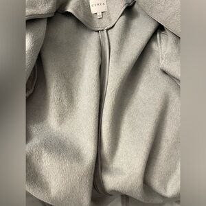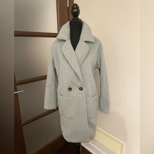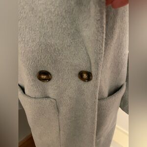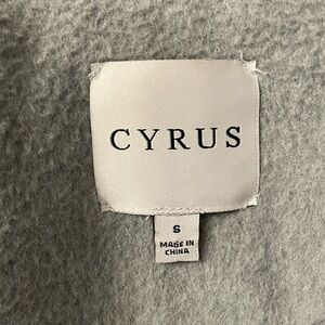 Introducing a stylish and versatile women's coat from Cyrus. This mid-length pea coat features a solid slate blue color, button closure, and a collared design. The outer shell is made of high-quality polyester material. Not lined and there is no material tag inside.