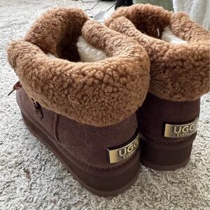 Warm brown suede boots with plush fur lining. Features multicolor laces for a stylish touch.