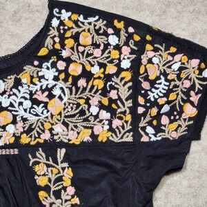 Keywords: Madewell tunic top, embroidered short sleeve top, black boho blouse, women's XS top, floral embroidered shirt, gathered bodice top, lace trim detail, casual women's top, brunch outfit top, relaxed fit blouse, bohemian style clothing, Madewell XS