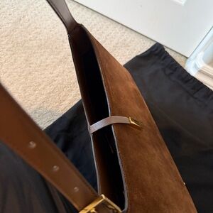 DeMellier's large Tokyo bag features an elongated arrow-shaped lock and an adjustable handle. Mocha brown suede on the front and smooth mocha leather on the back and sides