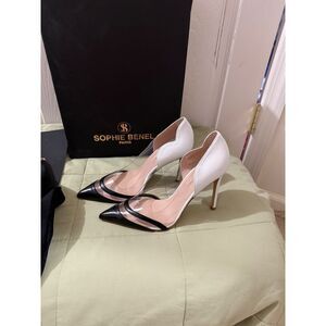 The Sophie Benel Paris NIHA white and black pointed-toe pumps are a stylish and elegant choice for women looking to make a fashion statement. The clear PVC sides add a modern touch to the classic pump design, making these heels a versatile option for both casual and formal occasions. With a comfortable heel height and a pointed toe shape that is on-trend, these pumps are a must-have for any fashion-forward woman's shoe collection.