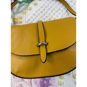 Keywords: mustard yellow, leather, crossbody, saddle bag, flap closure, silver buckle, textured leather, adjustable strap, everyday bag, fashionable, versatile, chic, elegant, sophisticated