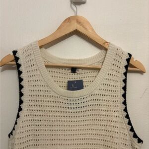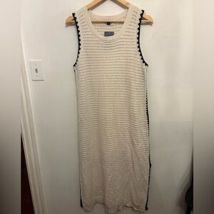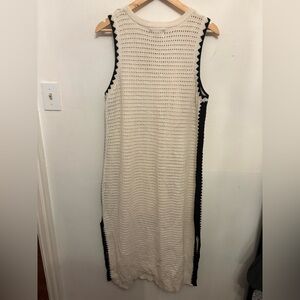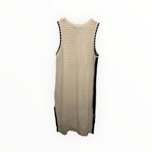 Chic knit midi dress with sleeveless design. Features beige body with black trim. Ideal for casual wear.
