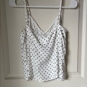 Brandy Melville Sleeveless top with thin straps in white with navy polka dots and a sweetheart neckline with light pleats at the bust.