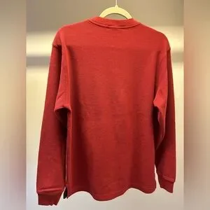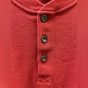 Classic long sleeve waffle knit Henley style. Rich red color. Buttoned neckline. Ideal for casual wear.