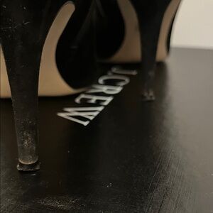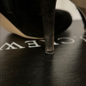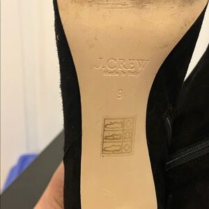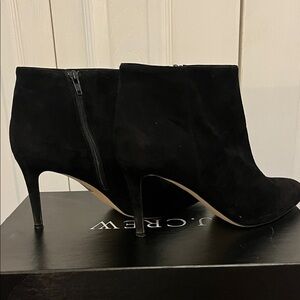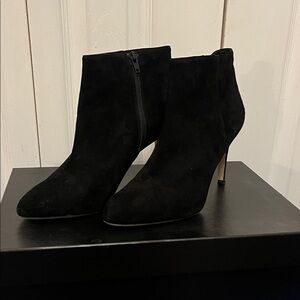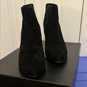 Suede black ankle booties with a stylish silhouette. Ideal for versatile wear. Wear on heels as shown in photos.