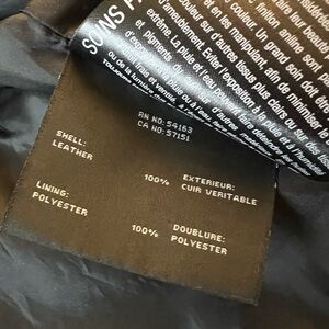 Stylish black leather jacket with quilted sleeves. Features zippered pockets and sleek design. Good condition. Beautiful supple leather. Stitching in one place on right shoulder is displaced as depicted in photo.