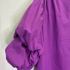 Chic purple midi dress with stylish puff sleeves. Perfect for any occasion.