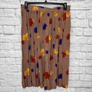 Vintage Houndstooth A-Line Midi Skirt Size 16 Brown Leaves Pleated Made in USA