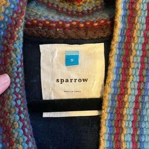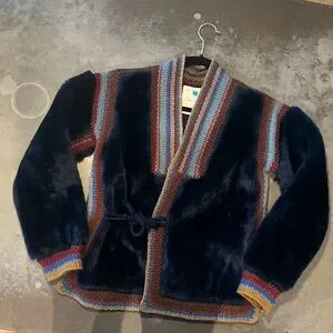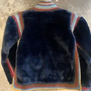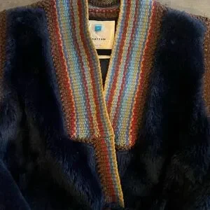 This is a Sparrow by Anthropologie navy faux fur boho coat jacket with multi-color striped woven trim and pom pom ties.