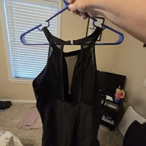 Elegant black one-piece swimsuit. Features a stylish cutout design. Perfect for beach or pool.