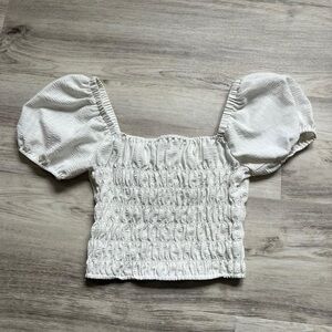 Crop top with flattering stretchy ruching details and puffy sleeves, can be worn on or off the shoulder. Excellent condition! Size small, approx 15” long