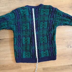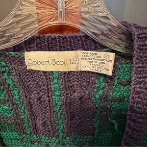 Stylish vintage knit cardigan featuring a unique green and purple pattern. Perfect for adding a pop of color to your wardrobe.