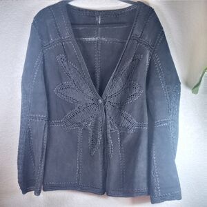 Black Suede Stitched Crochet Knit Butterfly Bohemian Bell Sleeve Hippie Jacket M