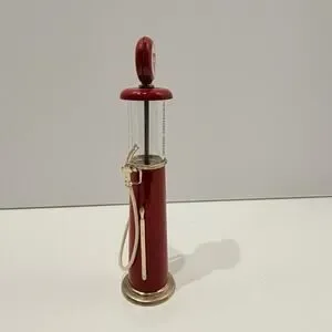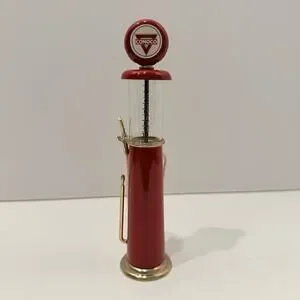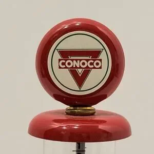 The product is a vintage Conoco gas pump miniature replica that stands at 7.5 inches tall and is in its original red color. This collectible item serves as advertising for the Conoco brand, making it a nostalgic piece for collectors interested in gas and oil memorabilia. Made in the USA, this miniature replica is a unique and eye-catching addition to any vintage decor or collection.